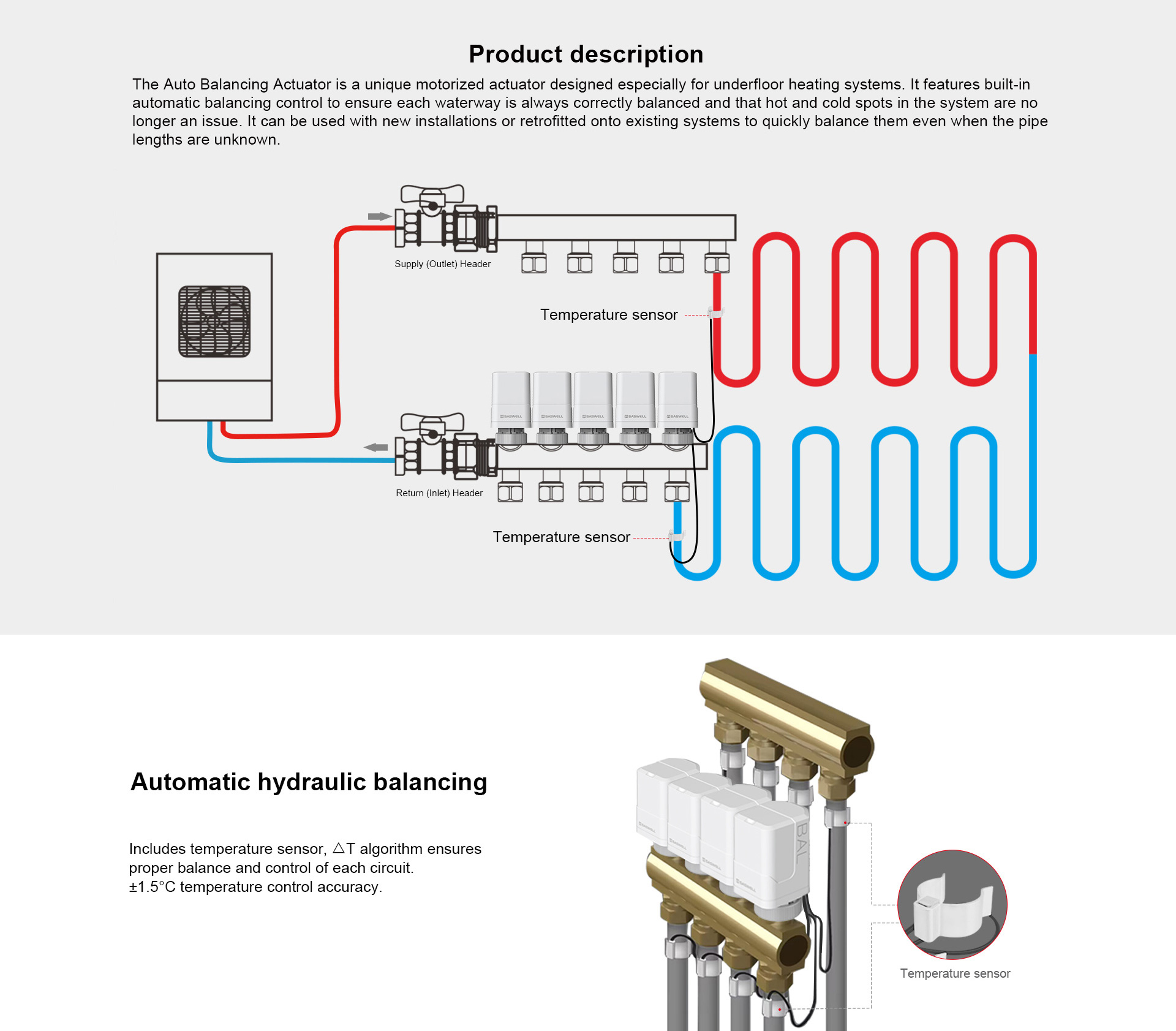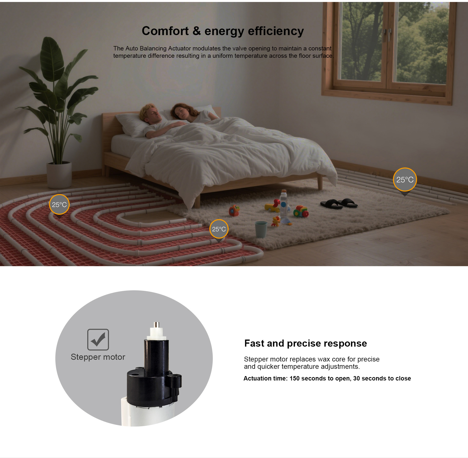 Автоматический балансировочный привод SASWELL SA905-T — это интеллектуальное решение для систем тёплого пола, разработанное для повышения комфорта, энергоэффективности и надёжности системы. Благодаря передовому алгоритму управления ΔT он автоматически балансирует нагревательные контуры, обеспечивая равномерное распределение тепла и сокращая ненужное потребление энергии.