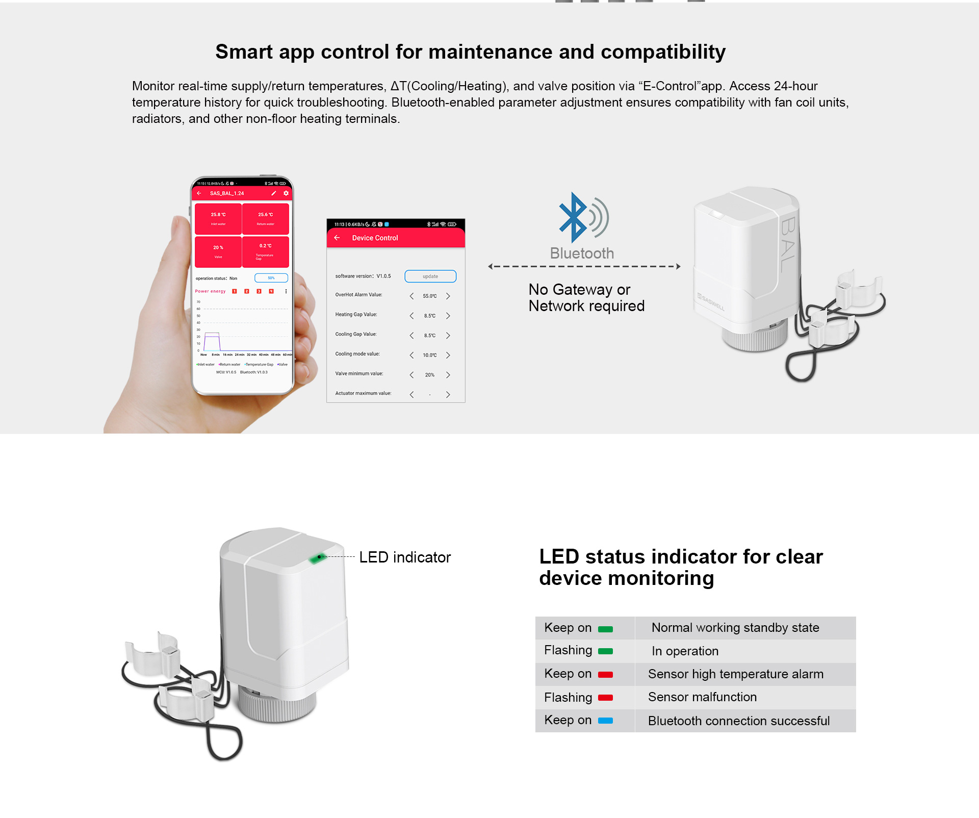 Благодаря прецизионному моторизованному приводу и быстродействующему клапану, SA905-T обеспечивает стабильную работу как при новых установках, так и при модернизации. Благодаря управлению через Bluetooth-приложение пользователи могут легко контролировать и регулировать настройки системы без необходимости использования шлюза или подключения к Интернету.