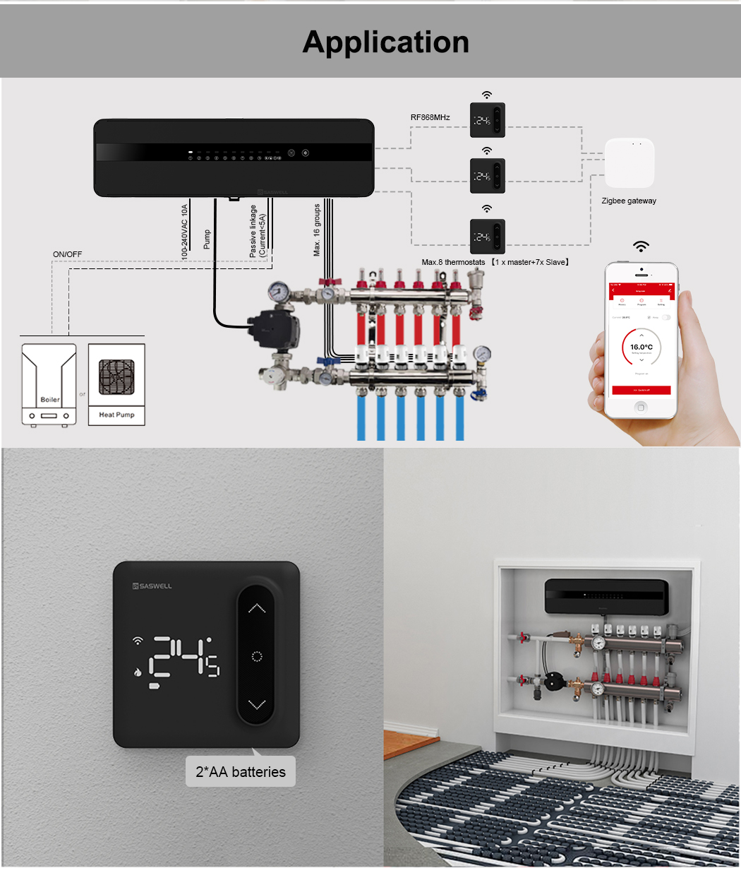 Беспроводная система лучистого отопления и охлаждения SASWELL разработана для современных жилых и коммерческих зданий и обеспечивает полную совместимость с котлами и тепловыми насосами. Она может управлять как лучистым отоплением, так и охлаждением, обеспечивая комфортную атмосферу в помещении круглый год. связь RS-485 , он легко интегрируется с системами автоматизации зданий (BAS) и платформами умного дома, отвечая потребностям подрядчиков и дистрибьюторов в различных приложениях.